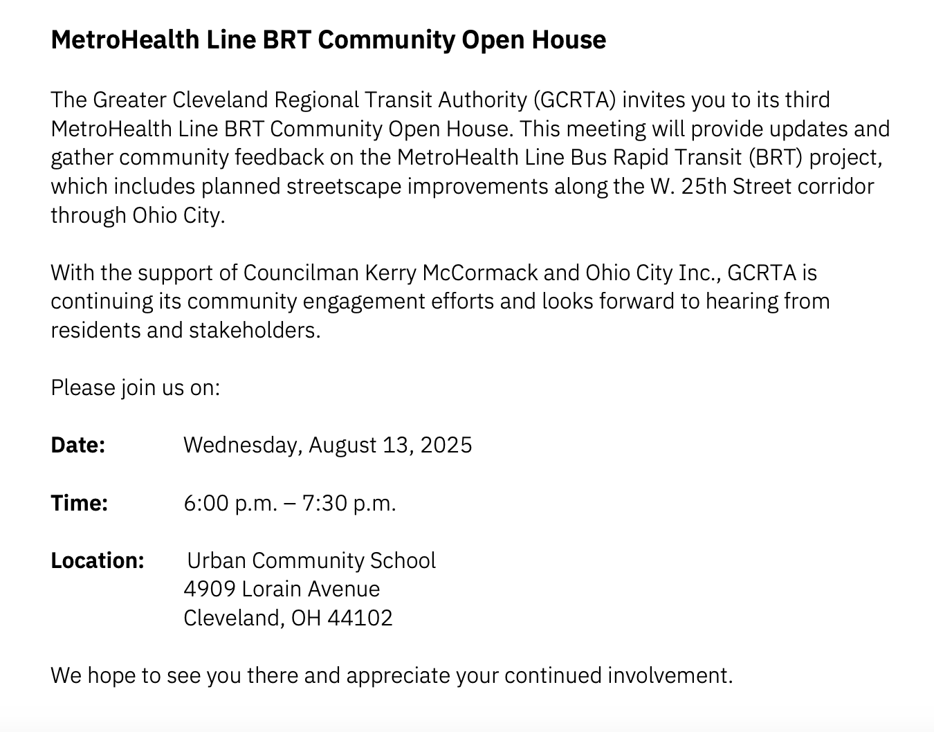 This meeting will provide updates and gather community feedback on the MetroHealth Line Bus Rapid Transit (BRT) project, which includes planned streetscape improvements along the W. 25th Street corridor through Ohio City. With the support of Councilman Kerry McCormack and Ohio City Inc., GCRTA is continuing its community engagement efforts and looks forward to hearing from residents and stakeholders.